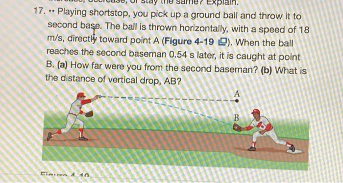 Problem 417 Playing shortstop you pick up a ground ball and throw it to second base. The ball is thrown horizontally with a speed of 24ms directly toward point A Figure 1. Playing shortstop you pick up a ground ball and throw.