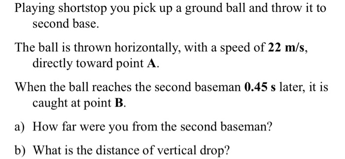 Playing shortstop you pick upa ground ball and throw it to second base. When the ball reaches the second baseman 042 s later it is caught at point B. Playing shortstop you pick up a ground ball and throw it to second base.